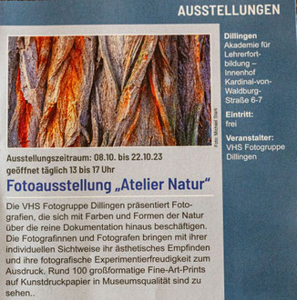VHS-Fotogruppe Dillingen, präsentiert die Fotogruppe Fotografien, die sich mit Farben und Formen der Natur über die reine Dokumentation hinaus beschäftigen.